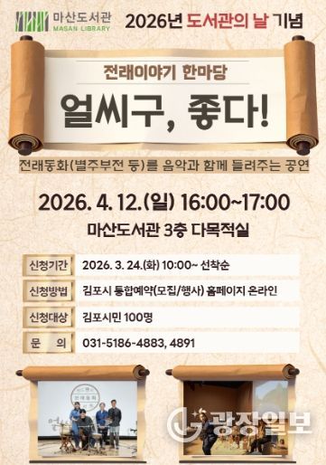 광장일보 주재영 기자 | 김포시 마산도서관은 제4회 도서관의 날을 맞아 오는 4월 12일 오후 4시부터 5시까지 마산도서관 3층 다목적실에서 전래이야기 한마당 '얼씨구, 좋다!'를 운영한다.
