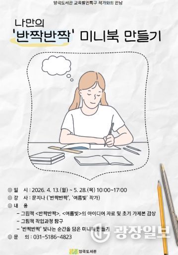 광장일보 주재영 기자 | 김포시 양곡도서관은 2026년 교육발전특구 사업의 일환으로 4월 13일부터 5월 28일까지 관내 초등학생을 위한 스트레스 관리 프로그램 '나만의 ‘반짝반짝’ 미니북 만들기'를 운영한다.