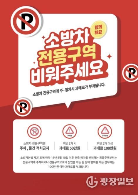 광장일보 주재영 기자 | 경산소방서는 화재 등 긴급 상황 발생 시 신속한 소방차 출동과 원활한 현장 활동을 위해 공동주택 내 소방차 전용구역 주차 금지 준수를 시민들에게 당부한다고 밝혔다.