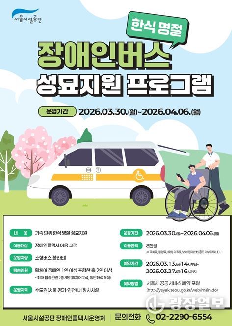 광장일보 주리아 기자 | 서울시설공단은 한식(4월 6일)을 맞아 장애인 가족의 성묘 이동 편의를 돕기 위해 ‘나들이 동행버스’를 활용한 성묘지원 버스를 운영한다.