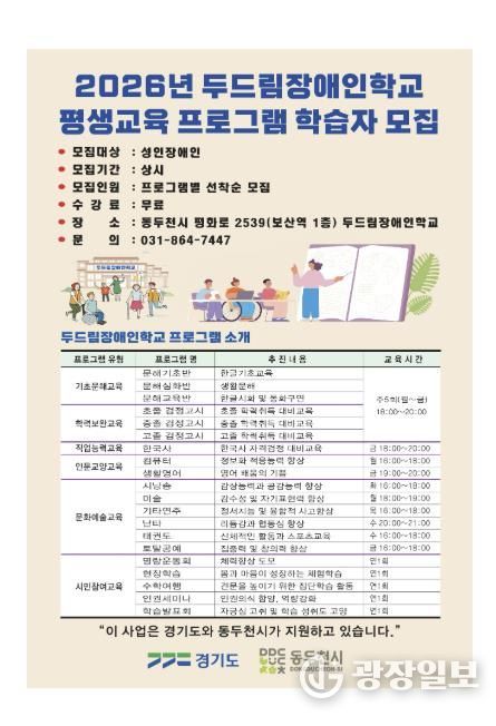 광장일보 주재영 기자 | 동두천시가 장애인 평생교육 진흥을 위해 지원하고 있는 두드림장애인학교가 2026학년도 평생교육 프로그램 학습자를 모집한다.