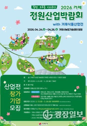 광장일보 주재영 기자 | 정원식물과 다양한 정원자재를 한자리에서 만나볼 수 있는‘2026 거제정원산업박람회’가 오는 4월 24일부터 26일까지 3일간 거제시 농업기술센터 일원에서 개최된다.