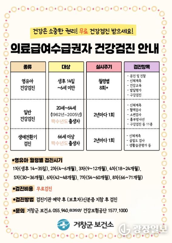 광장일보 주재영 기자 | 거창군은 의료급여수급권자의 건강증진과 질병 예방을 위해 2026년도 건강검진 비용을 연중 지원한다.