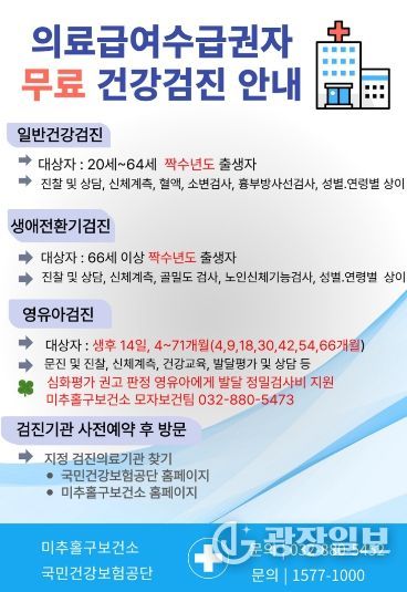 광장일보 주재영 기자 | 인천 미추홀구가 의료 취약계층의 질환을 조기에 발견하고 건강 증진을 도모하기 위해 ‘의료급여 수급권자 일반·영유아 건강검진 수검’을 적극 독려하고 있다.
