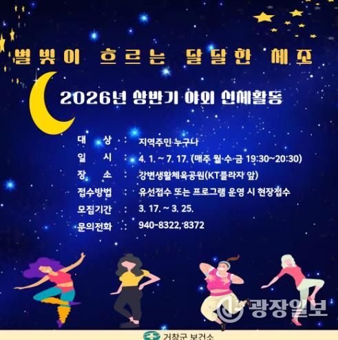 광장일보 주재영 기자 | 거창군은 지역주민의 신체활동 실천을 돕고 건강한 생활습관 형성을 위해 오는 4월 1일부터 7월 17일까지 야간 야외체조 프로그램 ‘별빛이 흐르는 달달한 체조’를 운영한다.