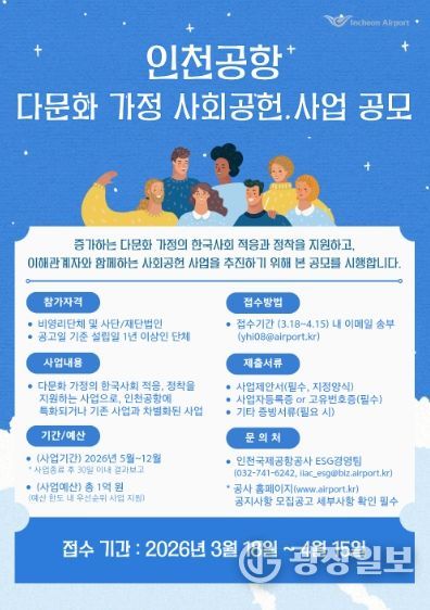 광장일보 주재영 기자 | 인천국제공항공사는 다문화 가정의 한국사회 정착을 위한 사회공헌 사업에 참여할 기업을 공모한다고 17일 밝혔다.