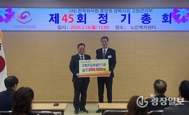 광장일보 주재영 기자 | 3월 16일 고령군 노인복지센터 강당에서 개최된 ‘사)한국외식업중앙회 경북지회 고령군지부 제45회 정기총회’에서 고령군지부 임직원은 지역의 교육 발전과 인재 양성을 위해 사용해 달라며 교육발전기금 200만원을 기탁했다.