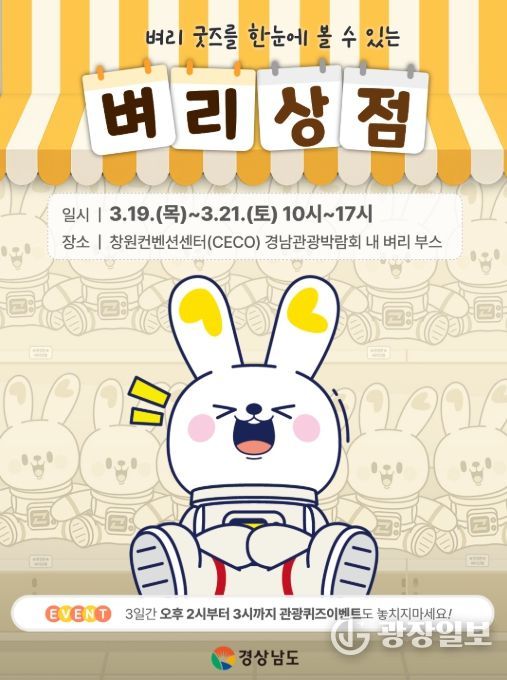 광장일보 주재영 기자 | 경상남도는 3월 19일부터 21일까지 3일간 창원컨벤션센터(CECO)에서 열리는 ‘2026 경남관광박람회’에 참가해 도 홍보캐릭터 ‘벼리’를 주인공으로 한 팝업스토어 ‘벼리 상점’을 선보인다.