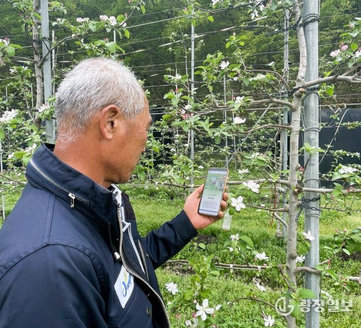 광장일보 주재영 기자 | 장성군이 사과·배 농가에 화상병 예방 약제를 지원하고 있다.