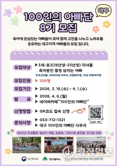 광장일보 주재영 기자 | 대구광역시는 아빠들의 적극적인 육아 참여를 독려하고 함께 육아하는 사회 분위기를 확산하기 위해 3월 18일부터 ‘2026년 제8기 대구 100인의 아빠단’ 활동 단원을 모집한다.