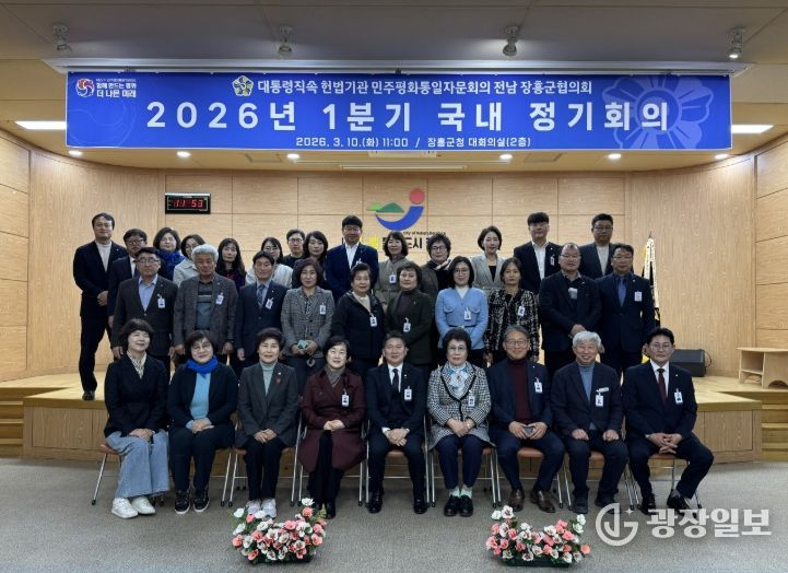 광장일보 주재영 기자 | 민주평화통일자문회의 전남 장흥군협의회는 3월 10일 장흥군청 대회의실에서 노영환 장흥군부군수, 김종근 협의회장, 자문위원 35명이 참석한 가운데 "2026년 1분기 국내 정기회의"를 개최했다.