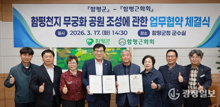 함평군은 17일 “함평천지 무궁화 공원 조성을 위한 함평군과 함평근화회 간 업무협약 체결식이 이날 오후 군수실에서 열렸다”고 밝혔다.