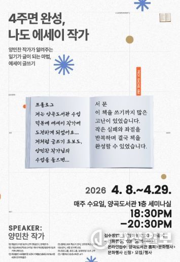 광장일보 주재영 기자 | 양곡도서관은 오는 2026년 4월 8일부터 4월 29일까지 매주 수요일 오후 6시 30분부터 8시 30분까지, 총 4회에 걸쳐 '4주면 완성! 나도 에세이 작가' 프로그램을 운영한다고 밝혔다.
