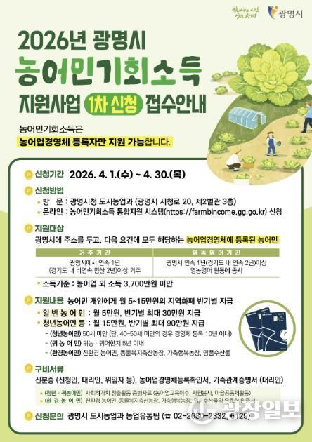 광장일보 주재영 기자 | 광명시는 오는 4월 1일부터 4월 30일까지 ‘농어민 기회소득 지원사업 1차’ 신청을 받는다.