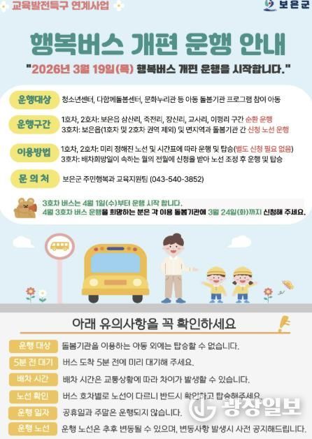 광장일보 이현나 기자 | 충북 보은군은 교육발전특구사업의 일환으로 2025년 7월부터 운영 중인 ‘행복버스’를 오는 19일부터 개편 운행한다고 밝혔다.