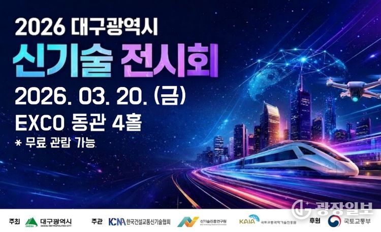 광장일보 주재영 기자 | 대구광역시는 건설 및 교통 분야의 우수 신기술을 소개하고, 기술 교류와 산업 활성화를 도모하기 위해 3월 20일 엑스코에서 ‘2026 신기술 전시회’를 개최한다.