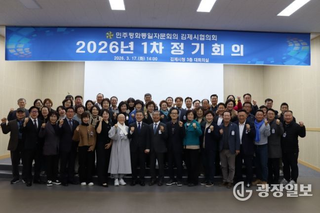 광장일보 주재영 기자 | 민주평화통일자문회의 김제시협의회는 3월 17일 오후 2시 김제시청 대회의실에서 정성주 시장, 자문위원 등 54명이 참석한 가운데 ‘한반도 평화공존을 위한 대내외 정책 추진방향’을 주제로 ‘2026년 1분기 정기회의’를 개최했다.