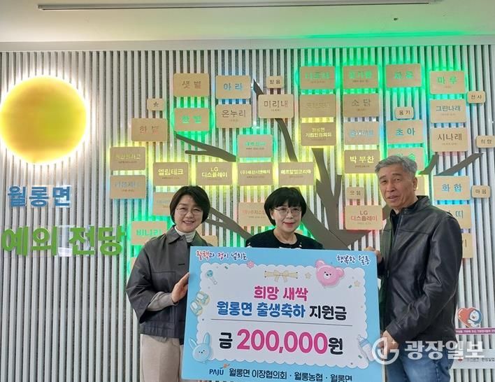 광장일보 주재영 기자 | 파주시 월롱면 이장협의회는 지난 17일 2025년 4분기 중 월롱면에서 태어난 출생아 가정에 1인당 20만 원의 ‘월롱 하나로마트 상품권’을 전달했다.