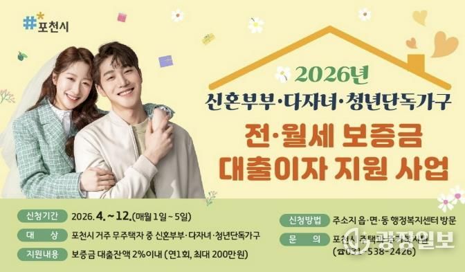 광장일보 주재영 기자 | 포천시는 ‘2026년 신혼부부·다자녀·청년가구 전월세 보증금 대출이자 지원사업’을 추진한다.