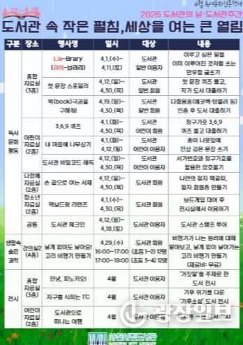광장일보 주재영 기자 | 사천시립도서관은 4월 도서관의 날 및 도서관 주간을 맞아 도서관을 보다 친숙하게 이용하고 책과 함께하는 즐거움을 느낄 수 있도록 ‘4월 독서문화진흥행사’를 운영한다.