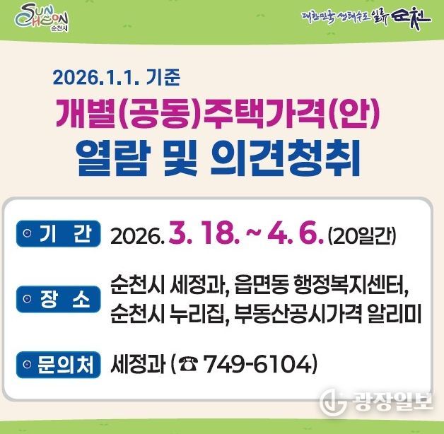 광장일보 주재영 기자 | 순천시는 1월 1일 기준 개별(공동)주택 가격 열람 및 의견제출 기간을 3월 18일부터 4월 6일까지 운영한다고 밝혔다.