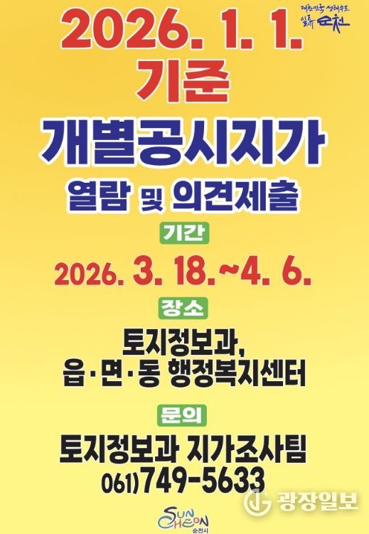광장일보 주재영 기자 | 순천시는 2026년 1월 1일 기준 개별공시지가의 열람 및 의견제출을 3월 18일부터 4월 6일까지 접수한다고 밝혔다.