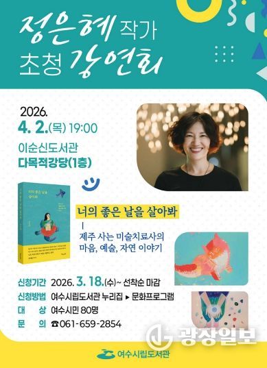 광장일보 주재영 기자 | 여수시는 오는 4월 2일 오후 7시 이순신도서관 다목적강당에서 정은혜 작가를 초청해 강연회를 개최한다고 밝혔다.