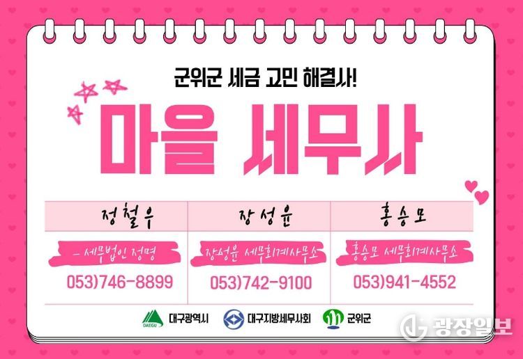 광장일보 주재영 기자 | 대구시 군위군은 세무 상담이 어려운 영세사업자 등 모든 군민들을 위해 ‘마을세무사 제도’를 운영하며 무료로 세무상담서비스를 제공하고 있다고 밝혔다. 마을세무사 제도는 세무사 이용이 어려운 군민들에게 지역 세무사들의 재능기부를 통해 국세와 지방세 관련 상담을 무료로 제공하는 제도로, 생활 속 세금 고민을 해소하고 납세자의 권익을 보호하기 위해 마련됐다.