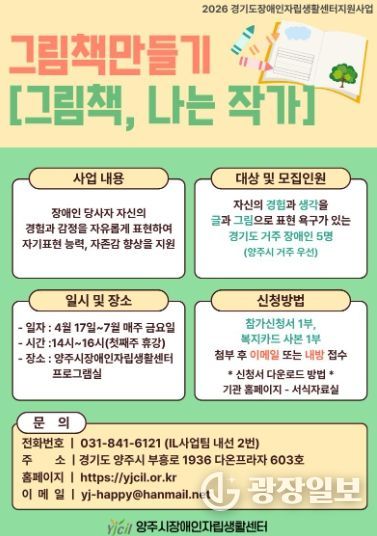 광장일보 주재영 기자 | 양주시장애인자립생활센터에서는 장애인의 문화·예술 참여 기회를 확대하고 자기 표현의 장을 마련하기 위해 그림책 만들기[그림책, 나는 작가] 참가자를 모집한다.