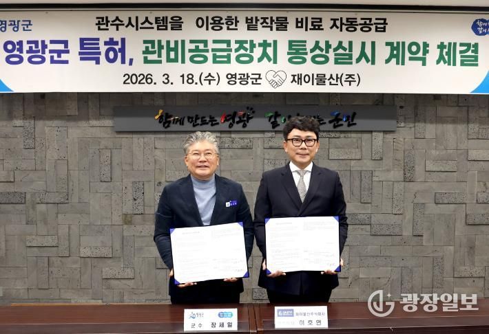 광장일보 주재영 기자 | 영광군은 지난 18일 전북 군산시에 위치한 재이물산(주)과 ‘관비공급장치’ 특허에 대한 통상실시권 계약을 체결했다고 밝혔다.