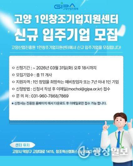 광장일보 주재영 기자 | 고양산업진흥원이 ‘고양 1인 창조기업 지원센터’ 2026년 1차 신규 입주기업을 모집한다.