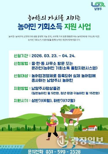 광장일보 주재영 기자 | 남양주시는 오는 23일부터 ‘2026년 농어민 기회소득 지원사업’을 신청받는다고 18일 밝혔다.