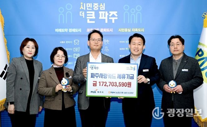 광장일보 주재영 기자 | 파주시는 지난 18일 엔에이치(NH)농협은행 파주시지부로부터 지난해 적립된 제휴카드 적립기금 172,703,590원을 전달받았다.