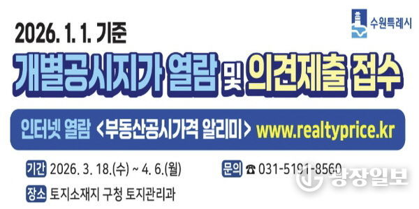 광장일보 박균현 기자 | 수원시 영통구는 3월 18일부터 4월 8일까지 20일간 2026년 1월 1일 기준 개별공시지가에 대한 열람을 실시하고 토지소유자 및 이해관계인의 의견을 접수한다.