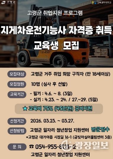 광장일보 주재영 기자 | 고령군은 구직자의 취업 역량강화를 위해 '고령군 일자리·청년창업지원센터'주관으로 지게차운전기능사 취득 지원사업 교육생을 모집하고 있다.
