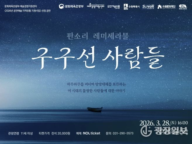 수원문화재단은 정조테마공연장에서 오는 28일 오후 4시, 문화체육관광부와 예술경영지원센터의 ‘2026 공연예술 지역유통 지원사업’ 선정작인 ‘판소리 레미제라블 '구구선 사람들'’을 선보인다.