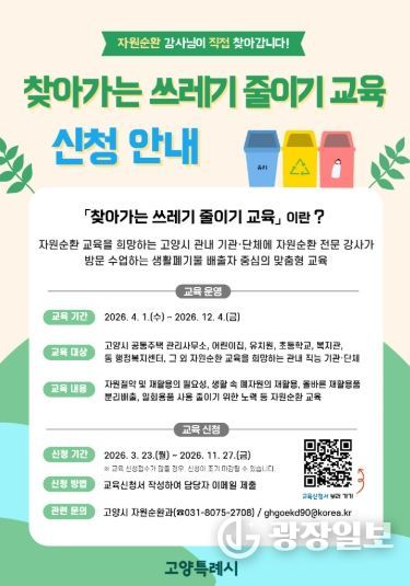 광장일보 주재영 기자 | 고양특례시는 생활 속 자원순환 실천을 유도하기 위해 오는 4월부터 12월까지 9개월간 ‘2026년 찾아가는 쓰레기 줄이기 교육’을 운영한다.