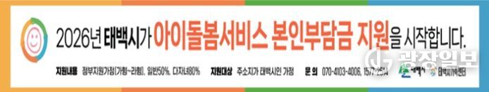 광장일보 이현나 기자 | 태백시는 양육 공백이 발생하는 가정의 경제적 부담을 경감하고 아이 키우기 좋은 환경을 조성하기 위해 ‘아이돌봄서비스 본인부담금 지원사업’을 시행하고 적극적인 홍보에 나선다고 밝혔다.