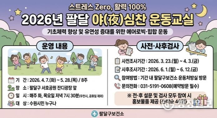 광장일보 박균현 기자 | 수원시 팔달구보건소가 시민들의 건강 생활 실천을 돕고 비만율을 낮추는 프로그램 ‘2026년 팔달 야(夜)심찬 운동교실’을 운영한다.