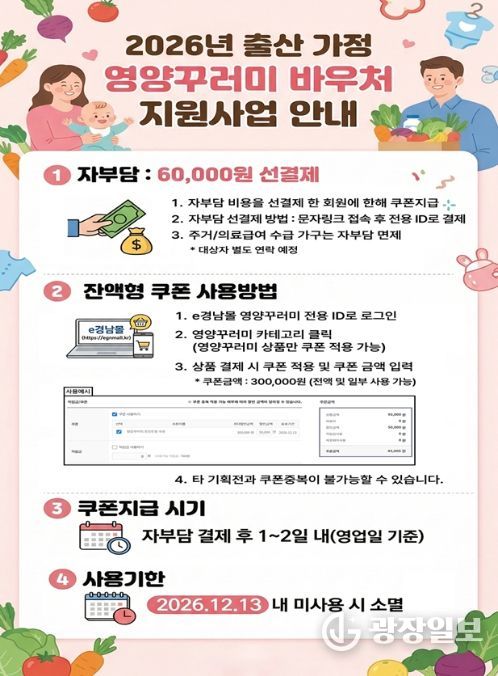 광장일보 주재영 기자 | 경상남도는 영아 출산가정의 건강한 식생활 지원과 경제적 부담 경감을 위해 ‘출산가정 영양꾸러미 바우처 사업’을 23일부터 본격 시행한다고 밝혔다.