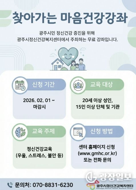 광장일보 주재영 기자 | 광주시정신건강복지센터는 지역 내 기관 및 단체를 대상으로 정신건강 인식 향상과 정신질환 예방을 위한 ‘2026년 찾아가는 마음 건강 강좌’를 오는 11월까지 운영한다고 20일 밝혔다.