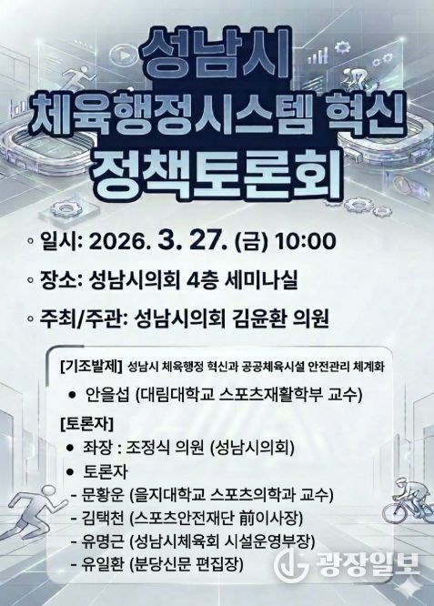 광장일보 주재영 기자 | 성남시의회 김윤환 의원(문화복지체육위원회)은 오는 27일, 성남시 체육행정의 혁신 방향을 모색하기 위한 '성남시 체육행정시스템 혁신 정책토론회'를 개최한다고 밝혔다.