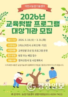 광장일보 주재영 기자 | 이천시는 도시농업 기반 조성 및 활성화를 위해 2026년 도시농업 교육텃밭 프로그램 대상자를 3월 31일까지 모집한다고 밝혔다.