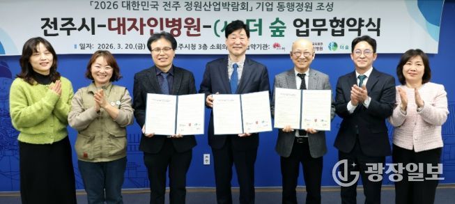 전주시와 대자인병원(이사장 이병관), 사단법인 더숲(대표 정명운)은 20일 시청 3층 소회의실에서 ‘2026 대한민국 전주정원산업박람회’ 기업동행정원 조성을 위한 업무협약을 체결했다.