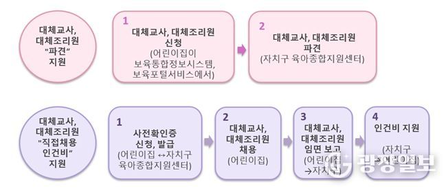 먼저 대체교사·대체조리원 파견 신청을 하고, 파견 지원이 어려운 경우엔 어린이집 직접채용 인건비 지원을 신청하면 된다.
