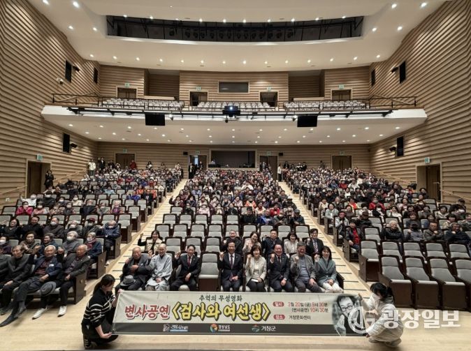 광장일보 주재영 기자 | 거창군은 지난 20일, 거창문화센터 공연장에서 거창군 삶의 쉼터 주관으로 어르신 400여 명을 모시고 개최한 무성영화 변사극 ‘검사와 여선생’ 공연이 성황리에 마무리됐다고 밝혔다.