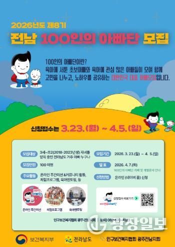 광장일보 주재영 기자 | 전라남도는 아빠의 육아 참여를 확대하고 가족 중심의 건강한 양육문화를 확산하기 위해 2026년 제8기 전남 100인의 아빠단 참여자를 모집한다.