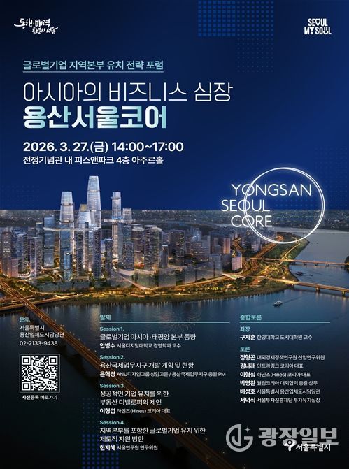 광장일보 주리아 기자 | 서울시는 3월 27일 금요일 오후 2시 용산구 전쟁기념관 내 피스앤파크 컨벤션에서 용산국제업무지구 내 글로벌기업 지역본부 유치를 위한 전략을 모색하는 포럼을 개최한다.