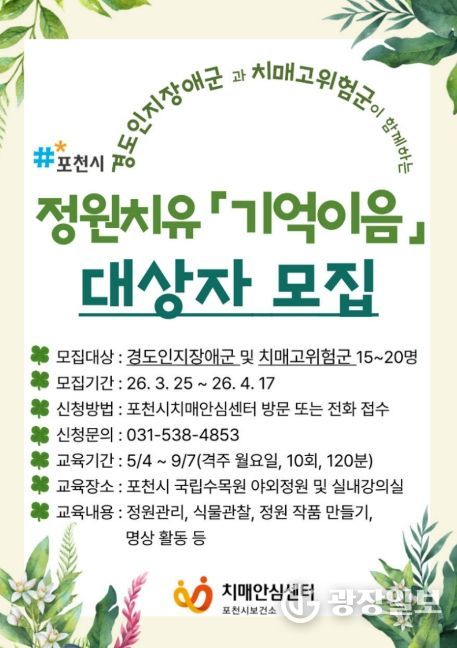 광장일보 주재영 기자 | 포천시 치매안심센터는 국립수목원과 함께 경도인지장애군과 치매고위험군을 대상으로 정원 자원을 활용한 정원치유 프로그램 ‘기억이음’ 참여자를 모집한다.