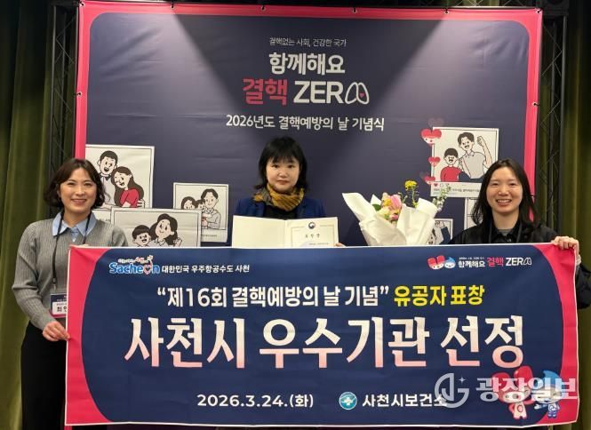 사천시보건소는 24일 서울 영등포구 글래드 여의도에서 열린 ‘제16회 결핵예방의 날’ 기념식에서 국가 결핵 예방사업에 기여한 공로로 질병관리청장 표창을 받았다.